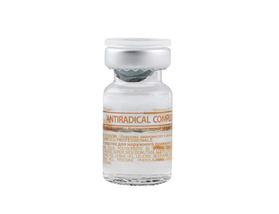 Аntiradical complex – готовый коктейль на основе антиоксидантов и аминокислот, используется как по лицу, так и по телу. Ускоряет пролиферацию фибробластов, стимулируя их рост, что способстует синтезу коллагена, эластина, эндогенной гиалуроновой кислоты. Оказывает мощное антиоксидантное действие , применяется в программах профилактики и коррекции фотостарения. Эффективен при коррекции стрий.