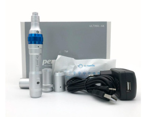 Аппарат для фракционной мезотерапии / микронидлинга с двумя батареями Дермапен Dr.pen ULTIMA-А6 представляет собой прибор в виде ручки-манипулы из алюминия с латексным покрытием рабочей поверхности, который подходит для обработки кожи лица и тела.