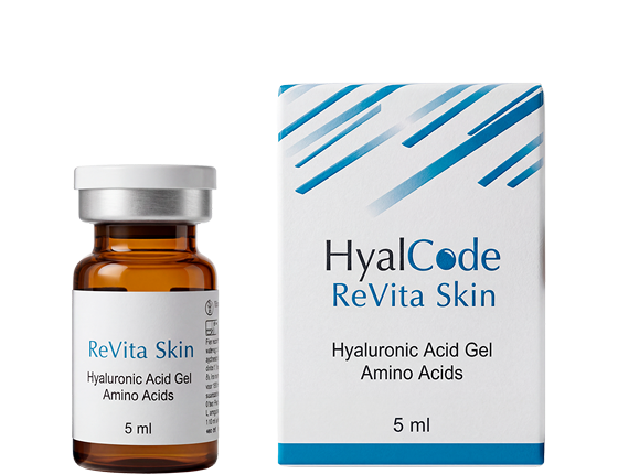Экзопротекторный биоревитализант HyalCode ReVita Skin работает на клеточном уровне, защищает коллаген и эластин от повреждений экзогенными факторами, значительно усиливает синтез молодых опорных волокон, а также других белковых структур дермы. Применяется как эффективное средство для коррекции и профилактики обезвоженности, морщин, снижения тонуса и эластичности, неровного рельефа и других возрастных изменений кожи.