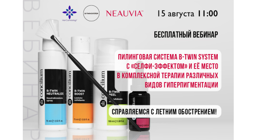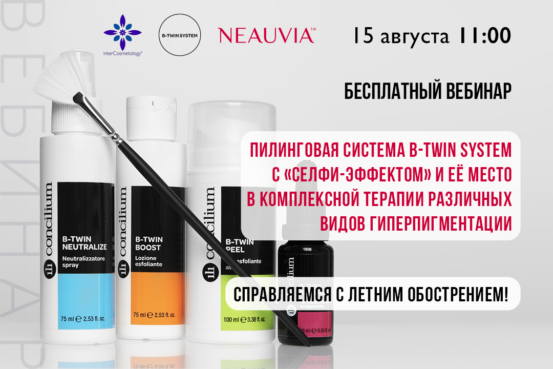 Приглашаем вас принять участие в бесплатном вебинаре «Справляемся с летним обострением: пилинговая система B-Twin System с «селфи-эффектом» и её место в комплексной терапии различных видов гиперпигментации», который состоится 15 августа, 11.00-12.00(по московскому времени).